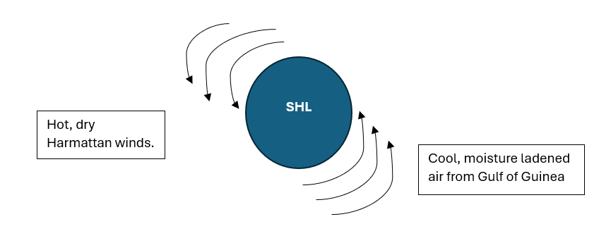 There are two air masses which determine the weather conditions – also known by Quantities of Interest QoI’s of West Africa. Namely, the Saharan Heat Low (SHL), which sits in the north of the region, is characterised by hot air – warmed through solar insolation, that rises up rapidly through the troposphere, diverging at upper levels, to the Mediterranean High and the Gulf of Guinea. A particularly intense SHL will reinforce the south-westerly monsoon flow along its eastern flank, and the north-easterly Harmattan flow along the western flank, allowing for convection along the coast of the Gulf of Guinea, meanwhile inhibiting most convection over Senegal (Lavaysse, C. et al). This is supported by a simple diagram below showing the counter-clockwise flow of the SHL.
